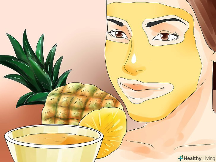 Скористайтеся ананасовим соком або зробіть ананасову маску.налийте в миску трохи ананасового соку (переконайтеся в тому, що це 100 %-ний ананасовий сік без додавання цукру, або самі приготуйте його з ананаса). За допомогою ватної палички обробіть соком все пігментні плями і почекайте, коли він висохне. Потім сполосніть шкіру прохолодною водою.- Як варіант, можна потовкти кілька шматочків ананаса і нанести отриману пасту на обличчя і будь-які інші ділянки шкіри з пігментними плямами. Зачекайте, поки маска не висохне, а потім змийте її прохолодною водою.