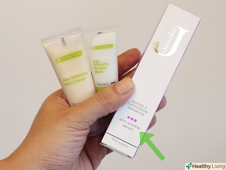 Користуйтеся кремом від зморшок.креми від зморшок не прибирають їх, проте допомагають трохи замаскувати, що робить вашу шкіру молодшою і красивішою.[13] у вас не повинні бути завищені очікування щодо кремів від зморшок, проте вони на якийсь час можуть допомогти вашій шкірі виглядати краще. Звертайте увагу на такі інгредієнти як ретинол, екстракт чаю, ніацинамід і втамін С. ці інгредієнти сприяють поліпшенню еластичності шкіри і допомагають позбутися від пошкоджених клітин.[14]