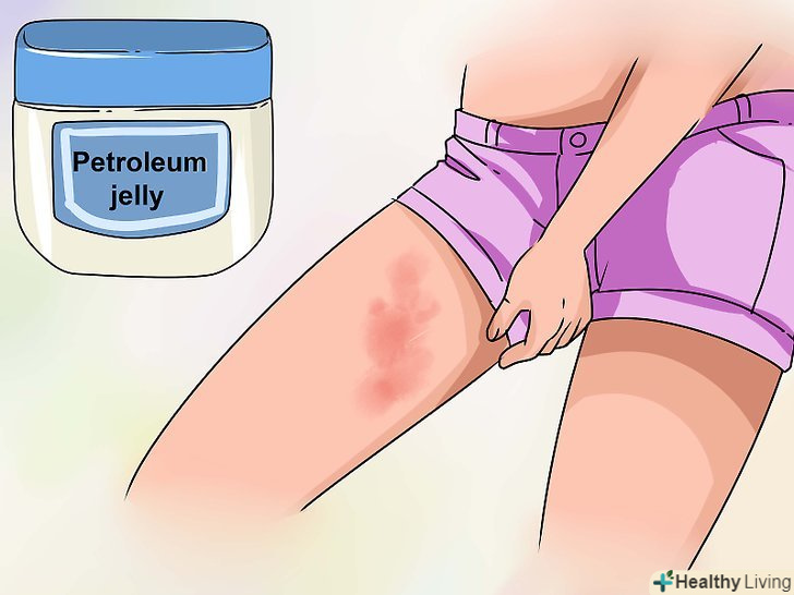 Нанесіть мазь.використовуйте вазелін, бальзам для тіла, крем від попрілостей або будь-який інший засіб, призначений для запобігання натертостей на шкірі. Деякі засоби спеціально націлені на те, щоб запобігти утворенню натертостей у спортсменів. Після нанесення мазі уражену область можна закрити стерильною пов'язкою або тканим пластиром, який дає шкірі дихати.[3]- Якщо натерте місце занадто болить або кровоточить, то дізнайтеся у лікаря, який засіб слід наносити на рану в цьому випадку. Ви повинні бути в змозі нанести цей засіб на всю уражену область.[4]