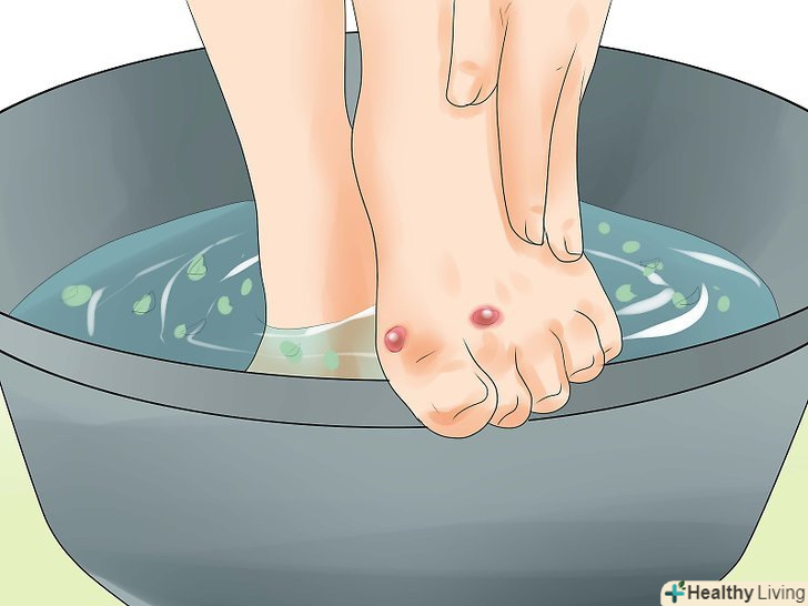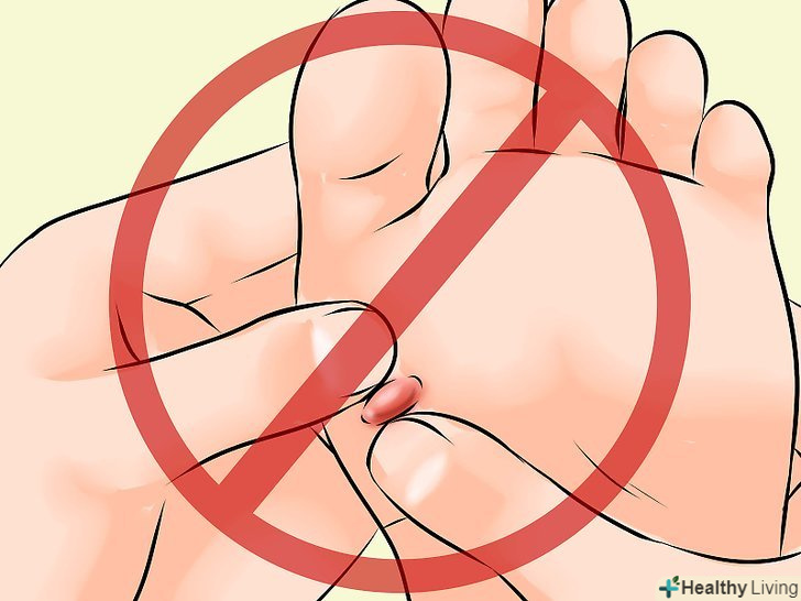 Розпізнайте симптоми інфекції.якщо мозоль інфікована, вона буде заповнена каламутною, жовтуватою або зеленуватою рідиною. Шкіра навколо мозолі буде червоною, набряклою і трохи боліти. Якщо у вас більше трьох-чотири інфікованих мозолів, не намагайтеся їх лікувати самостійно. Для цього вам знадобиться медична допомога.[11]- Якщо навколо мозолі або від неї на шкірі виходять червоні смуги, з мозолі постійно тече рідина, область навколо мозолі болить і у вас висока температура – все це вказує на наявність більш серйозної інфекції (наприклад, лімфангіт).[12] в такому випадку обов'язково сходіть на прийом до лікаря.