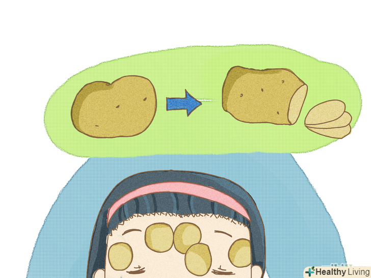 Покладіть кілька сирих скибочок картоплі на обличчя, щоб вилікувати акне.особливо якщо ви не витримали і видавили прищ, розмістіть недавно нарізану картоплю на проблемне місце, – це зможе не тільки заспокоїти, але зменшити можливість появи шрамів.- Очистіть і поріжте на скибочки звичайний сиру картоплю. Калій, сірка, фосфор і хлор в картоплі позбавлять вас від больових відчуттів через прищі.