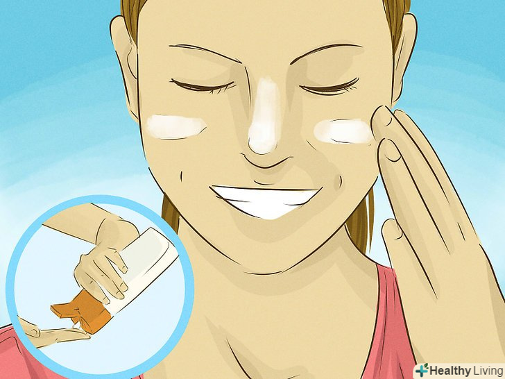 Захищайте шкіру від сонячного впливу.у деяких людей сонячне світло може спровокувати висипання на обличчі. Якщо ваша шкіра схильна до утворення прищів під сонцем, захищайте шкіру нежирним сонцезахисним кремом або зволожуючим кремом з сонцезахисним фактором.[5]- Крім іншого, сонячне світло викликає опіки, сприяє старінню шкіри і підвищує ризик розвитку раку шкіри.