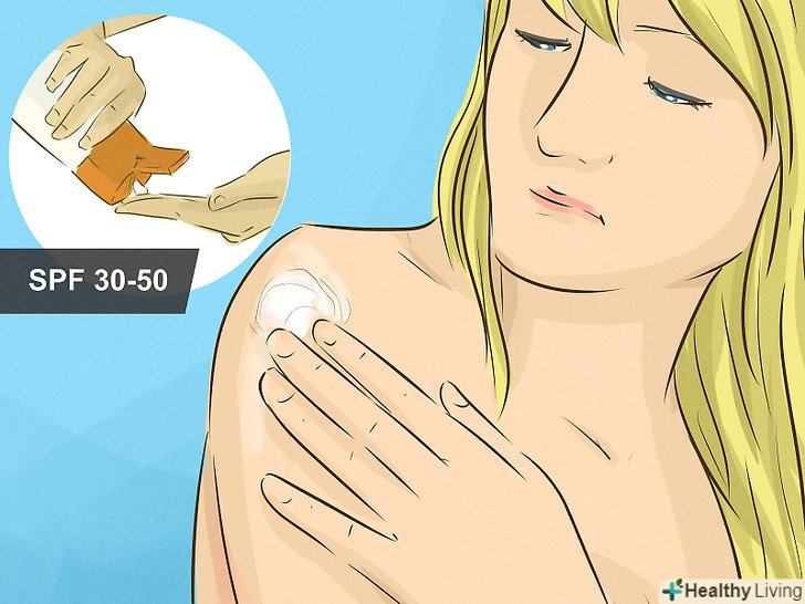 Наносите на шрам сонцезахисний засіб.використовуйте сонцезахисний засіб, щоб зменшити ймовірність пігментації (появи червоних і коричневих плям) навколо порізу або шраму. Крім того, сонцезахисні засоби захищають шкіру, зволожують її і сприяють оновленню покривних тканин.- Використовуйте сонцезахисні засоби широкого спектру дії з фактором захисту від сонця (SPF) від 30 і вище.