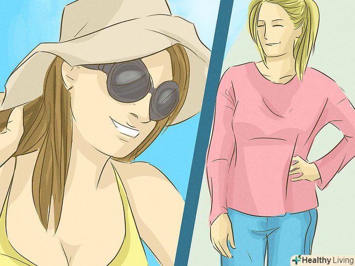 Обмежте час перебування під прямими сонячними променями.поки ваша рана або шрам заживають, намагайтеся проводити менше часу на сонці. Сонячні промені чинять негативний вплив на процес регенерації пошкодженої шкіри, що може погіршити стан шраму. Таким чином, якщо вам все-таки доведеться вийти з дому в сонячну погоду, обов'язково надіньте капелюх з широкими полями і закритий одяг, а також нанесіть сонцезахисний засіб.[11]