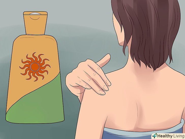 Наносите сонцезахисний крем.щоб запобігти раку шкіри, використовуйте косметичні продукти з сонцезахисним фільтром (SPF). Наносите крем з SPF 30 і більше на ті ділянки тіла, які будуть схильні до впливу сонця. Наносите приблизно 30 грам сонцезахисного крему, щоб покрити їм всю шкіру.- Наносите зволожуючий засіб з сонцезахисним фільтром на шкіру обличчя, щоб запобігти закупорці пір.[6]