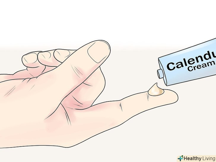 Наносите мазь календули три рази в день, щоб прискорити загоєння шкіри.Мазь календули можна наносити на відкриті рани і виразки, які кровоточать і сверблять, — це допоможе полегшити свербіж і прискорити загоєння шкіри. Спочатку промийте хворе місце теплою водою з милом. Потім нанесіть на шкіру мазь календули тонким шаром. Робіть це три рази в день, щоб шкіра швидше зажила.[7]- Календула відома своїми антисептичними властивостями, вона допомагає захистити рани і пророблені кліщами ходи в шкірі від вторинного інфікування іншими бактеріями. Крім того, календула заспокоює шкіру і зменшує свербіж.