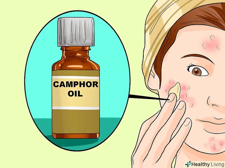 Нанесіть камфорове масло на уражені ділянки на шкірі.Камфора (Cinnamomum camphora) добре вбирається в шкіру і має заспокійливі, аналгетичні (болезаспокійливі) і антимікробні властивості. Але камфора також може викликати роздратування на шкірі, тому нанесіть ваткою трохи камфори на шкіру, щоб подивитися на реакцію.- Не наносьте протягом дня різні рослинні масла. Ті, що були згадані раніше, можуть мати позитивний вплив, але в поєднанні один з одним можливі проблеми (наприклад, роздратування на шкірі або свербіж).