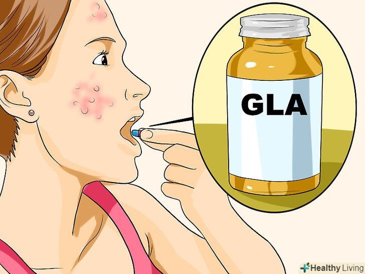 Спробуйте попринимать гамма-ліноленову кислоту (ГЛК).ГЛК є ефективним протизапальним засобом, який зміцнює здоров'я шкіри. Після поглинання ГЛК перетворюється в дигомо-гамма-ліноленову кислоту (ДГЛК), яка відповідає за більшість корисних властивостей ГЛК.[7] велика кількість ГЛК міститься в олії з насіння чорної смородини і олії первоцвіту вечірнього, які можна купити у вигляді рідини або в капсулах.- Почніть з 500 мг будь-якого масла двічі на день.