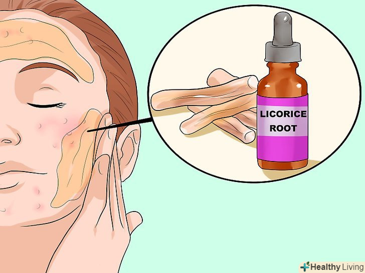 Нанесіть гель з екстрактом кореня лакриці. Лакриця (Glycyrrhiza glabra) знижує запалення, пригнічуючи фермент 11-бета-гідроксистероїддегідрогенази. Також було доведено, що лакриця значно зменшує почервоніння, набряк і свербіж у пацієнтів з дерматитом.[3]- Розацеа найчастіше вражає щоки, ніс, підборіддя, повіки і лоб.