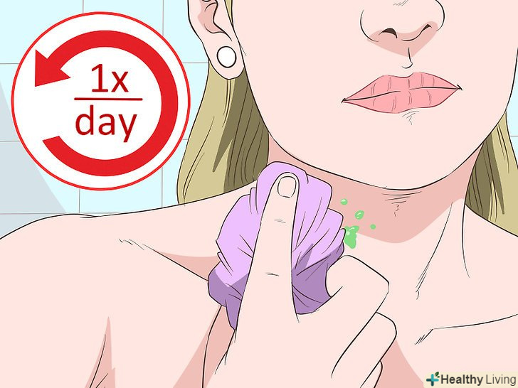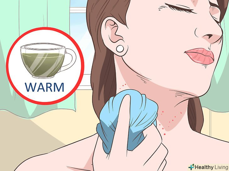 Нанесіть суміш на шию.переконайтеся, що розчин не надто гарячий, щоб не обпекти шкіру. Дайте йому злегка охолонути. Після цього змочіть розчином чисту бавовняну мочалку для обличчя і нанесіть його на шию.[11]- Якщо висипом вражені лише окремі ділянки, можна нанести на них розчин за допомогою ватної палички або ватної кульки.