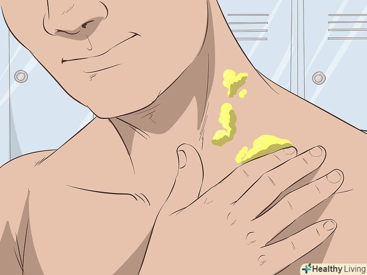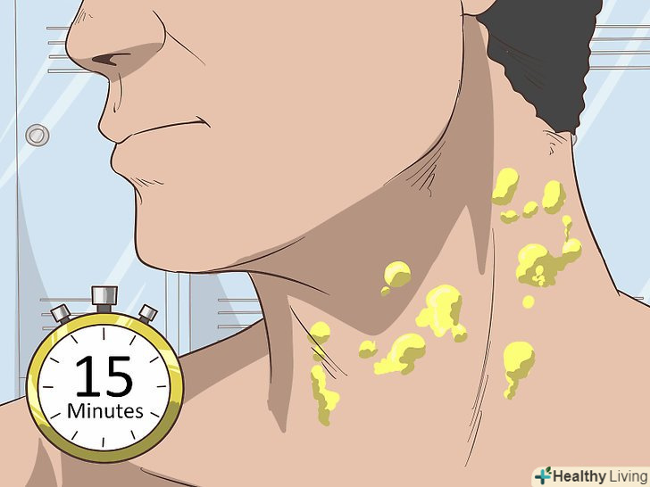 Дайте пасті висохнути на шиї, потім змийте її водою.залиште пасту приблизно на 15 хвилин, після чого змийте її злегка теплою водою. Можна прийняти для цього душ. Злегка проведіть по шиї пальцями і змийте пасту.[18]- Промокніть шию чистим бавовняним рушником і нанесіть на неї Некомедогенний засіб для зволоження шкіри.