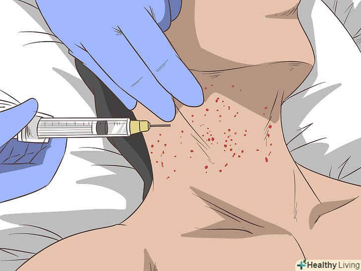 При кістозній формі вугрів подумайте про ін'єкції стероїдів.якщо дерматолог виявить на задній частині вашої шиї вузлувато-кістозні вугри, він може порекомендувати безпосередню ін'єкцію стероїдного засобу. Це допоможе швидко зняти набряк і позбутися від вугрів. Крім того, такі ін'єкції допомагають запобігти появі шрамів.[23]- До побічних ефектів даного методу відносяться потоніння шкіри і підвищена чутливість до світла. Також може тимчасово атрофуватися жировий шар під шкірою, що призводить до виду "впала" шкіри.