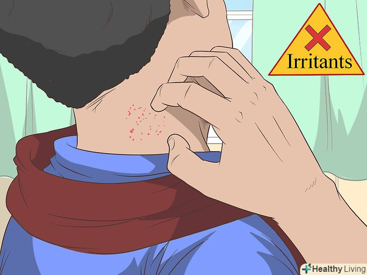 Уникайте подразників.хоча ви можете і не відчувати цього, одяг і аксесуари здатні дратувати шкіру шиї і погіршувати вугровий висип. Не носіть сорочки з тісним коміром, шарфи і светри з високим коміром, так як подібний одяг може дратувати шкіру і погіршувати вугровий висип. Слідкуйте, щоб все, що торкається вашої шиї, було чистим. Намагайтеся також рідше торкатися до шиї і ніколи не розчісуйте і не намагайтеся видавити вугри, так як це може привести до утворення шрамів.[4]- Намагайтеся не використовувати сонцезахисні креми на основі масла і не наносите на уражені вуграми ділянки основу для макіяжу або макіяж. Якщо Ви користуєтеся засобом для укладання волосся, стежте, щоб воно не потрапляло на шию.[5]