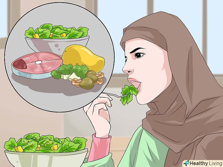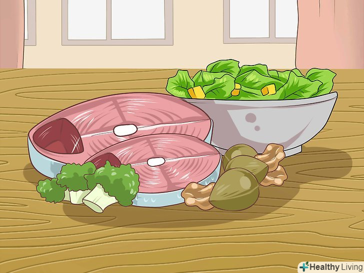 Вживайте вітамін D. Вітамін D також корисний для здоров'я шкіри. Кращий спосіб отримати потрібне організму кількість цього вітаміну - це провести на сонці 10-15 хвилин. Сонце стимулює вироблення шкірою вітаміну D. Але не забувайте наносити сонцезахисний засіб, щоб захистити шкіру від впливу шкідливих ультрафіолетових променів.[22]- Вітамін D також можна отримувати з їжею. Цього вітаміну багато в рибі, в риб'ячому жирі, в молочних продуктах (молоко, йогурт, сир). Нерідко в продукти спеціально додають цей вітамін.