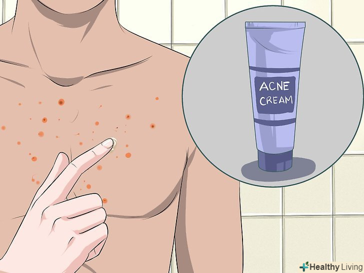Спробуйте застосовувати крем проти вугрової висипки.існує безліч кремів і спеціальних місцевих засобів для лікування акне. Навіть якщо на засобі не написано, що воно підходить для лікування висипу на грудях, вам воно підійде. Купіть засіб, до складу якого входить перекис бензоїлу, саліцилова кислота або альфа-оксикислоти.[25]- Без рецепта можна купити найрізноманітніші креми та мазі, але якщо вам потрібно сильнодіючий засіб (наприклад, з антибіотиком), зверніться до лікаря, і він випише рецепт.