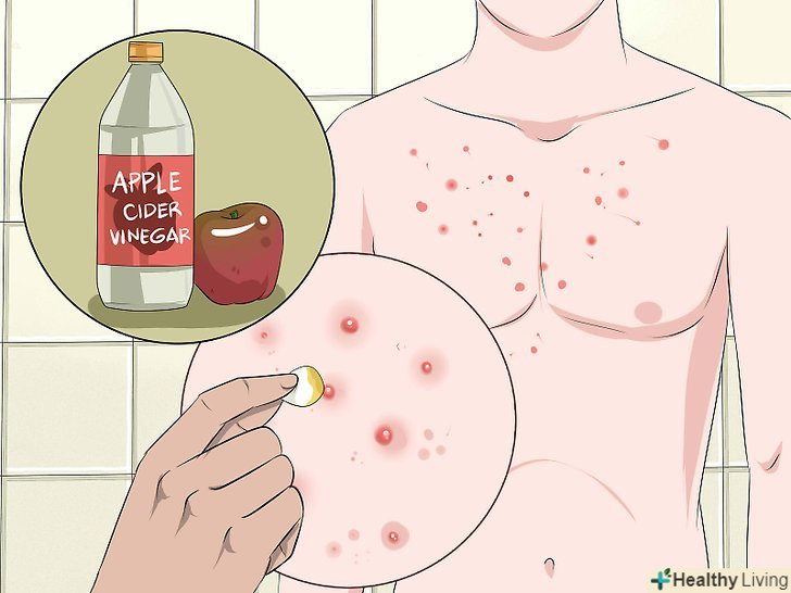 Спробуйте обробляти шкіру розчином яблучного оцту.яблучний оцет допомагає боротися з висипом вугрів на грудях і зменшує почервоніння. Оцет має антибактеріальні та антисептичні властивості. Його також можна наносити точково на окремі вугри.[11]- Змішайте одну частину оцту з однією частиною води. Краще використовувати органічний оцет.