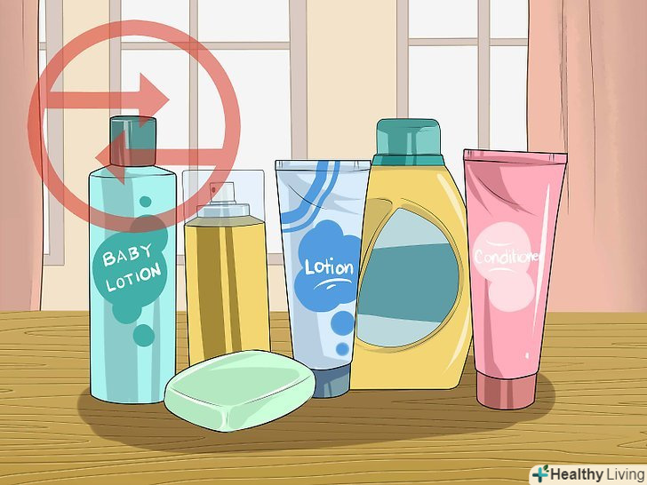 Замініть засоби по догляду за тілом.Акне на грудях може бути реакцією організму на засоби, якими Ви користуєтеся. Спробуйте перейти на засоби з меншою кількістю ароматизаторів, барвників і хімічних добавок. Це стосується і зволожуючих засобів. Зволожуйте шкіру грудей дитячим лосьйоном-такі засоби підходять чутливій шкірі.[17]- Замініть шампунь, кондиціонер та інші засоби для волосся. При змиванні вони виявляються на шкірі грудей.