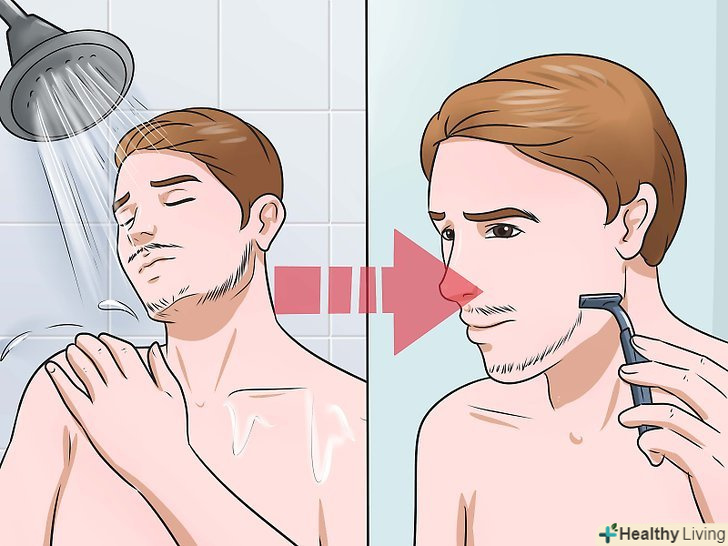 Голіться після прийому душу.оскільки прийом душу пом'якшує волосся, відкладіть гоління до цього часу.[14] щоб зволожити волосся на обличчі, вмийтеся теплою водою або прикладіть до обличчя теплий рушник.- Для цього візьміть рушник і потримайте його під теплою або гарячою проточною водою, поки воно повністю не просочиться водою. Потім вичавіть воду і прикладіть до обличчя. Залиште рушник приблизно на 5 хвилин.