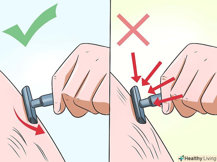 Не тисніть на бритву занадто сильно.занадто ретельне гоління може привести до появи врослого волосся на шкірі, тому не натискайте на бритву занадто сильно. Не тисніть на бритву, щоб не розтягувати шкіру.[16]
