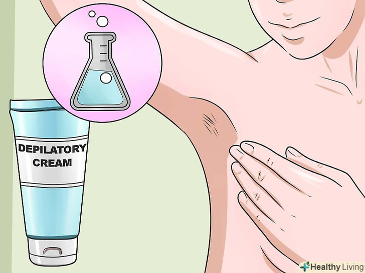 Користуйтеся хімічним засобом для видалення волосся.креми для депіляції також можуть знизити ймовірність появи гнійників і запалень. Але врахуйте, що ці кошти можуть викликати роздратування, так що перевірте його на невеликій ділянці, перш ніж наносити на іншу шкіру.[20]- Придбайте засоби, призначені для певних ділянок тіла. Наприклад, наносите на обличчя тільки креми, призначені для депіляції особи.