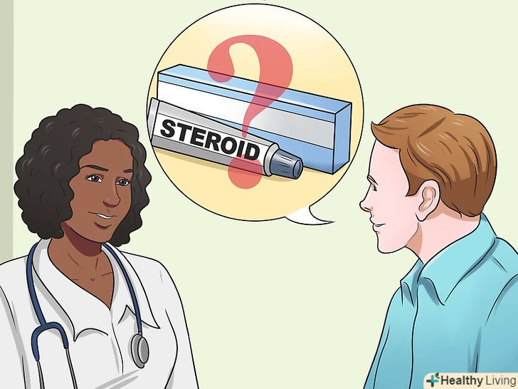Дізнайтеся у лікаря, чи слід вам почати користуватися мазями зі стероїдами, щоб зняти запалення.прищ, що утворився в результаті вростання волосся, може почервоніти і запалитися, що зробить його ще більш помітними. Мазі зі стероїдами не позбавлять вас від таких прищів, але зате вони допоможуть зняти почервоніння і набряк. Завдяки їм прищі не будуть так сильно виділятися на тлі решти шкіри.[10]