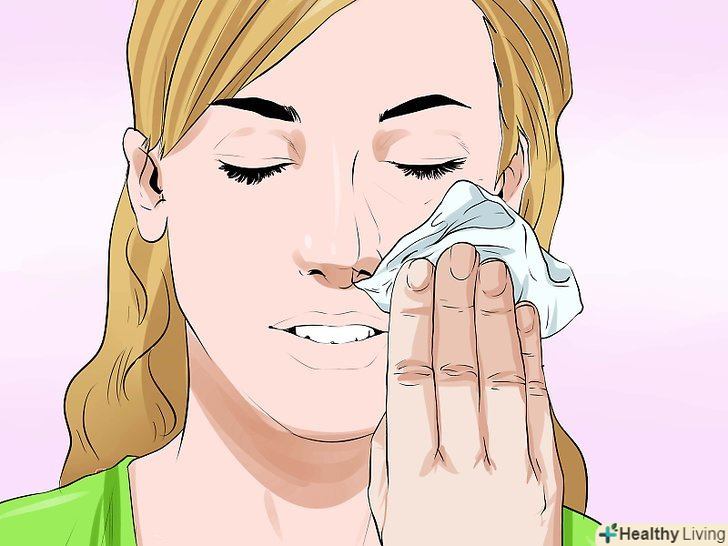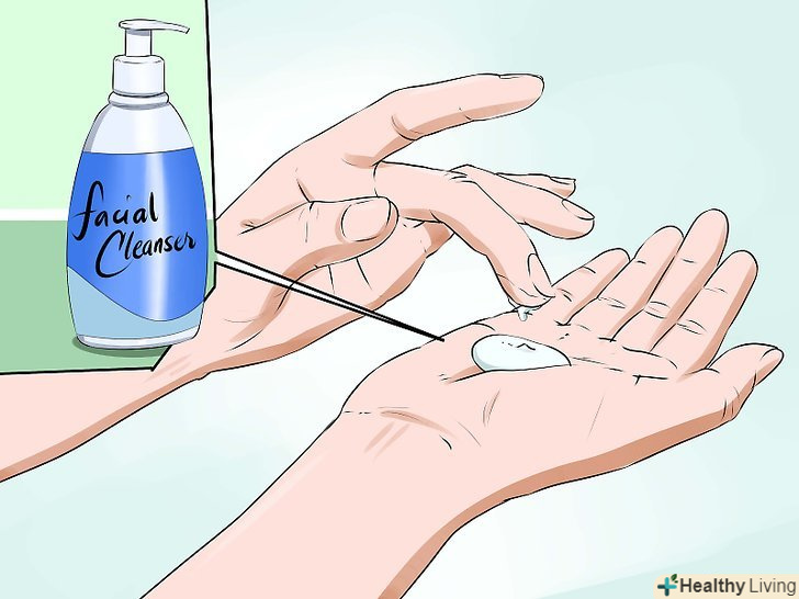 Наносите миючий засіб кінчиками пальців.при вугрової висипки на обличчі слід діяти обережно, тому для вмивання найкраще підходять м'які подушечки пальців. Не використовуйте мочалку для обличчя або губку, щоб не дратувати шкіру і не погіршити проблеми. Нанесіть миючий засіб легкими круговими рухами, а потім змийте його злегка теплою водою.[10]- Не тріть обличчя! Це може викликати роздратування, а в деяких випадках привести до утворення шрамів.