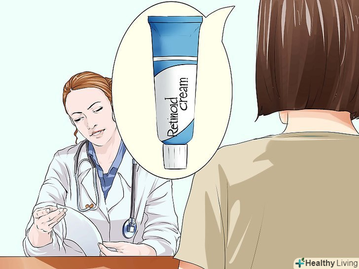 При помірній вугрової висипки дізнайтеся щодо крему або гелю з ретиноїдами.можливо, в разі слабкої або середньої гормональної вугрової висипки досить буде місцевого лікування ретиноїдами. Креми та гелі з ретиноїдами допомагають очистити пори шкіри від жиру і бруду і запобігають утворенню вугрів. Іноді поряд з кремом або гелем з ретиноїдами лікарі призначають антибіотики, які допомагають боротися з бактеріями при вугрової висипки. Дерматолог може виписати також гель Дапсон або порекомендувати креми, гелі або розчини з бензоїлпероксидом.[1]