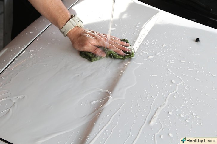 Обдайте автомобіль чистою водою.зробивши це, ви видалите більшу частину забруднень і побачите місця, яким в подальшому доведеться приділити особливу увагу.- Приділіть час повної мийці автомобіля, навіть якщо деревна смола знаходиться не на всій його поверхні. Ви отримаєте ще більше задоволення після видалення смоли, коли ваш автомобіль в кінці процесу виявиться ще і чистим, і блискучим. Тим більше що всі приналежності для початку мийки вже готові до використання.