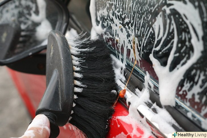 Вимийте автомобіль з милом і гарячою водою.переконайтеся, що видалили весь бруд і глибоко в'їдаються забруднення з поверхні навколо смоли. Якщо гаряча вода і мило не допомогли, продовжуйте читати статтю.- Навіть якщо просто змити смолу не вийде, тепла вода розм'якшить її, що допоможе при подальшому видаленні. Це також набагато полегшить процес, якщо смола вже деякий час перебувала на автомобілі.
