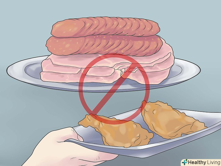 - Обмежте вживання жирної яловичини, ковбаси, сосисок, свинини, шинки, страв з м'ясного фаршу. Ці продукти піддаються глибокій обробці, і в них міститься велика кількість насичених жирів.
