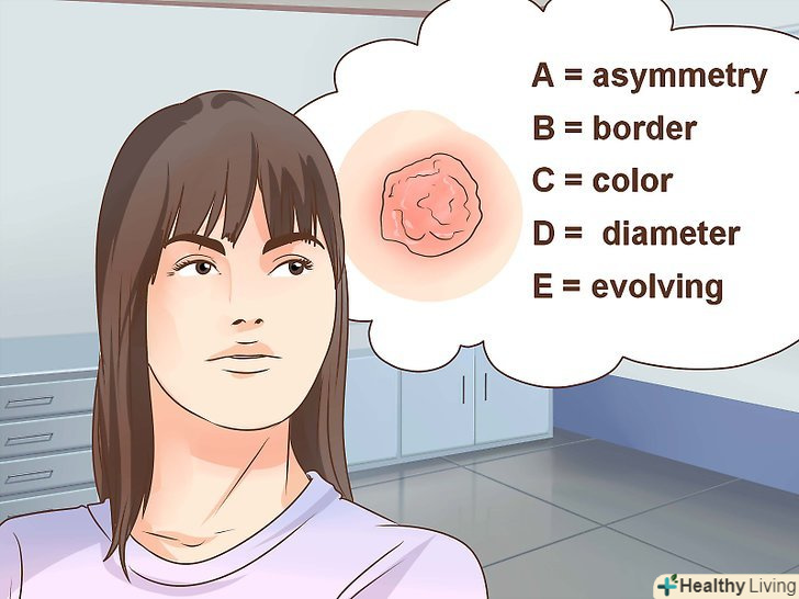 Навчіться дізнаватися різні типи раку шкіри.важливо бачити різницю між звичайними відмітками на шкірі (веснянки, родимки, бородавки, вугри) і раковими утвореннями. Наприклад, базальноклітинна карцинома на перших стадіях часто проявляється ущільненнями перлового кольору, а потім дає метастази, які виглядають як шрами коричневого або тілесного кольору.[6] Сквамозная карцинома виражається в твердих червоних вузликах, які дають плоскі метастази з сухою лущиться поверхнею. Меланома найчастіше проявляється великими коричневими плямами з темними точками, або дрібними метастазами з нерівними краями і кольоровими точками (червоними, білими, чорно-синіми).- Базальноклітинна карцинома, як правило, розвивається на ділянках шкіри, які часто піддаються впливу сонячних променів (наприклад, на шиї або обличчі).