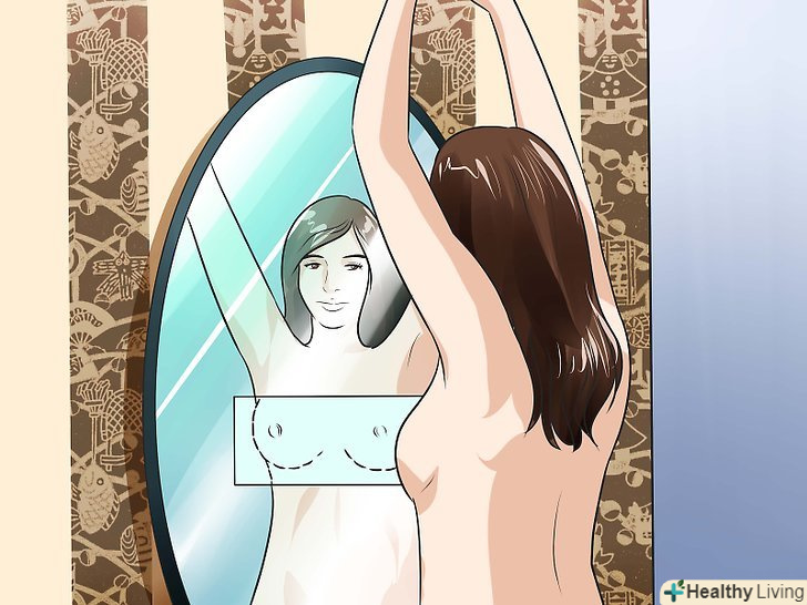 Проведіть візуальний огляд.Встаньте, поклавши руки на стегна, і огляньте себе в дзеркалі. Оцініть розмір, колір і форму грудей, чи немає ніяких відхилень від норми. Якщо у вас з'явилися будь-які з наступних симптомів, повідомте про це свого лікаря:- Помітне набухання грудей, хоча місячних у вас на даний момент немає