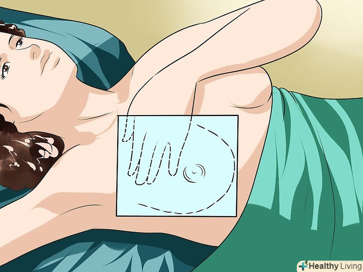Промацайте груди.ляжте на спину. Зведіть разом вказівний, середній і безіменний пальці правої руки. Промацуйте ліву груди подушечками трьох середніх пальців невеликими круговими рухами.[7] їх окружність повинна становити 2 сантиметри.[8] Промацуйте груди, рухаючись від ключиці до живота. А потім, почавши з пахвовій області, рухайтеся від боку до середини. Повторіть процес з протилежною рукою і протилежною грудьми. Щоб переконатися, що ви промацали всю область, рухайтеся вертикальними лініями. Потім встаньте або сядьте і повторіть ці кроки. Пройдіться по всій поверхні грудей. Багато жінок вважають за краще виконувати цей останній крок в душі.[9]- Перевірте наявність грудок або інших змін. Повідомте свого лікаря про будь-які виявлені грудки.