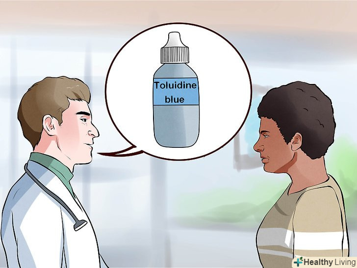 Дізнайтеся у лікаря, чи буде він використовувати спеціальні барвники при огляді порожнини рота.під час огляду деякі лікарі використовують спеціальні оральні барвники, які допомагають краще побачити всі патологічні області в роті, особливо це важливо, якщо у ви ставитеся до групи ризику по раку порожнини рота.[13] наприклад, в одному з методів використовується барвник, який називається толуїдиновий синій.- Якщо нанести толуїдиновий синій на ракову область, пляма стане темно-синього кольору, набагато темніше оточуючих здорових тканин.