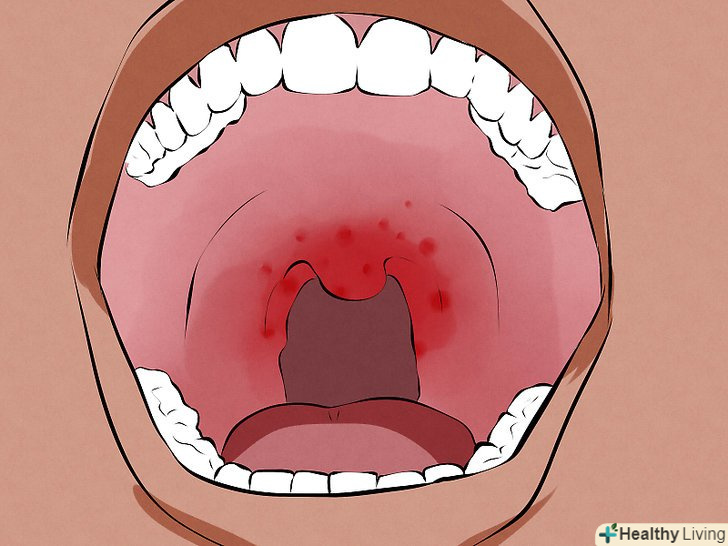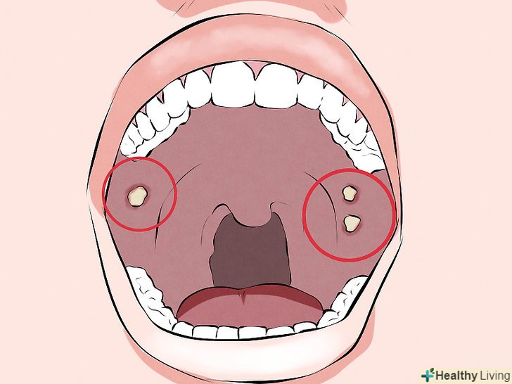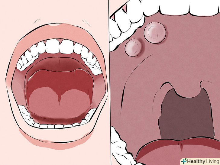 Зверніть увагу на маленькі білі виразки в порожнині рота.перевірте, чи немає в порожнині рота маленьких білих виразок або ранок – лікарі називають подібний симптом лейкоплакією. Лейкоплакія є поширеною ознакою раку порожнини рота, проте її легко переплутати зі стоматитом або просто невеликими виразками, викликаними незначними травмами.[5] лейкоплакію також легко переплутати з бактеріальною інфекцією ясен і мигдалин, а також з кандидозної інфекцією порожнини рота (молочницею).- Стоматит та інші види виразок зазвичай дуже болючі, а лейкоплакія найчастіше не викликає будь-яких дискомфортних відчуттів, за винятком тих випадків, коли рак досягає пізніх стадій.
