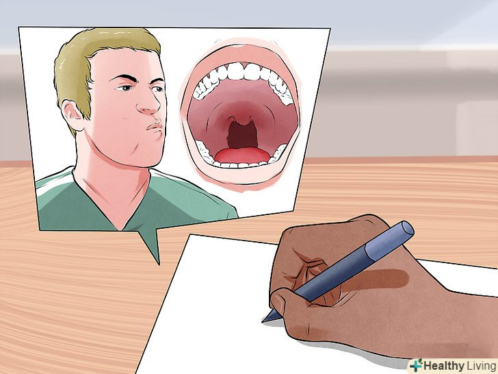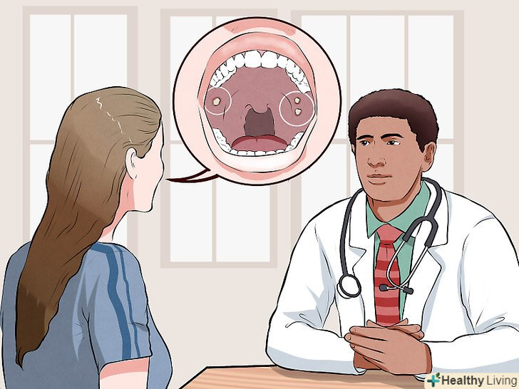 Запишіться на прийом до терапевта або стоматолога.При будь-яких вищеописаних симптомах, які не проходять протягом двох тижнів або погіршуються, вам слід якомога швидше звернутися до лікаря. Можна звернутися до сімейного лікаря, якщо він також є оториноларингологом, але, ймовірно, найкраще почати зі стоматолога, щоб виключити будь-які інші неракові захворювання порожнини рота і вилікувати їх, щоб виключити дискомфортні відчуття.- Крім огляду ротової порожнини (включаючи губи, щоки, язик, ясна, мигдалини і горло) лікар повинен оглянути вашу шию, вуха і ніс – все це допоможе визначити проблему.