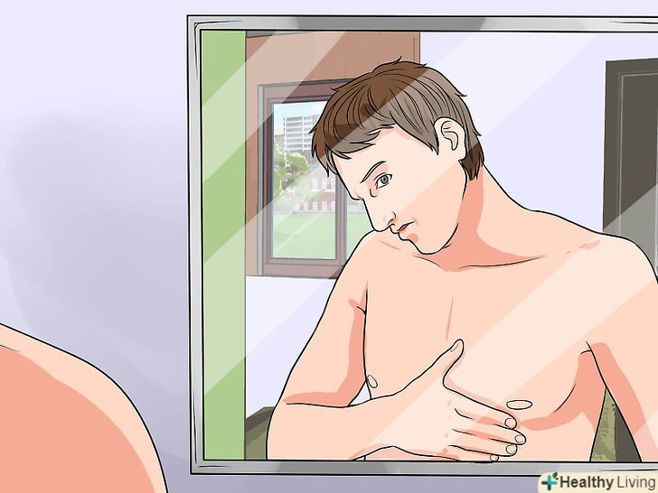 Огляньте груди на наявність незвичайних проявів.в результаті раку на шкірі можуть з'явитися незвичайні освіти. Якщо ви будете стежити за станом грудей, ви зможете вчасно провести самостійний огляд і звернутися до лікаря.- Регулярно оглядайте груди і шкіру на грудях, щоб вам було простіше виявити зміни вчасно. Стаєте перед дзеркалом і оглядайте груди як мінімум раз на тиждень або раз на місяць, особливо якщо ви знаєте, що у вас підвищений ризик розвитку цього захворювання. Порівнюйте груди між собою, звертайте увагу на зміни у формі і текстурі. Якщо помітите незвичайні зміни, промацайте груди.