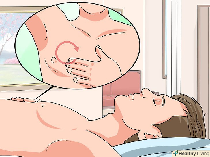 - Покладіть пальці на груди. Потім почніть натискати на тканини круговими рухами. Почніть з самого верхнього краю грудей і просуньтеся до соска. Пройдіться по всій грудях, а потім повторіть те ж саме з другої сторони.