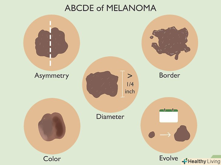 Спробуйте виявити ознаки меланоми.рання діагностика особливо важлива, якщо ми говоримо про меланому. Справа в тому, що це найнебезпечніший вид раку шкіри. Меланому можна вилікувати тільки в тому випадку, якщо вона виявлена на ранній першій стадії. Якщо меланома встигла прогресувати і була діагностована тільки на пізніх стадіях (на 3-4), лише в 15% випадків (навіть менше) таким пацієнтам вдається прожити довше декількох років. Пошкоджень шкіри, пов'язаних з меланомою, притаманні такі ж характеристики. Тобто при обстеженні шкіри потрібно звернути увагу на ті ж ознаки, засновані на зручній систематизації онкологічних станів за схемою.- ПунктуA відповідає типова асиметрія, при якій одна область шкіри не відповідає іншій (розташованої симетрично).
