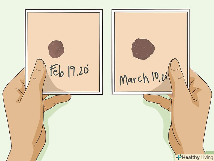 Слідкуйте за поразками.якщо при огляді шкірних покривів вам вдалося виявити у себе якийсь з трьох перерахованих видів уражень, стежте за їх динамікою. Будь-які підозрілі пошкодження і освіти потрібно зафіксувати( сфотографувати), і відзначити червоним на карті тіла людини. При огляді шкірних покривів в наступному місяці обов'язково зверніть увагу на будь-які зміни. Зробіть ще один знімок і порівняйте його з тим, що був зроблений минулого місяця.- Якщо ви помітили якісь зміни (навіть незначні), проконсультуйтеся з дерматологом. Візьміть з собою на прийом до лікаря карту тіла, яку ви склали, а також всі фотографії, що демонструють динаміку розвитку ураження — таким чином, ви зможете легко надати інформацію про нього.[10]
