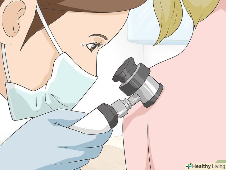 Зверніться до фахівця.якщо ви помітили на тілі якісь пошкодження, необхідно записатися на консультацію до дерматолога. Після прийому лікаря ви будете мати більш точне уявлення про ці пошкодження і зможете зрозуміти, чи можуть вони бути ознаками онкології (в разі, якщо так і є — дізнатися приблизну стадію). Якщо лікар за фізичними ознаками пошкодження приблизно зміг зрозуміти, до якого типу раку шкіри воно відноситься, обговоріть з ним всі можливі варіанти лікування, які будуть ефективні в цій ситуації. Лікар відразу ж може прийняти рішення про хірургічне висічення пошкодження, якщо він упевнений, що ця форма раку шкіри лікується оперативним втручанням. Якщо лікар сумнівається з приводу вибору способу лікування, швидше за все, він призначить вам дерматоскопію — ця процедура має на увазі уважне вивчення пошкодження під потужним мікроскопом.- Майте на увазі, що час від часу на шкірі можна помітити багато нових елементів і змін — в цю категорію можна включити нові або злегка змінюються з часом родимки, а також інші пошкодження, які не є за своєю природою онкологією. Тільки досвідчений фахівець після уважного огляду і вивчення результатів аналізів зможе оцінити характер пошкодження і вирішити, яке лікування буде необхідно в цьому випадку. Тому завжди краще перестрахуватися і зайвий раз пройти огляд у лікаря.