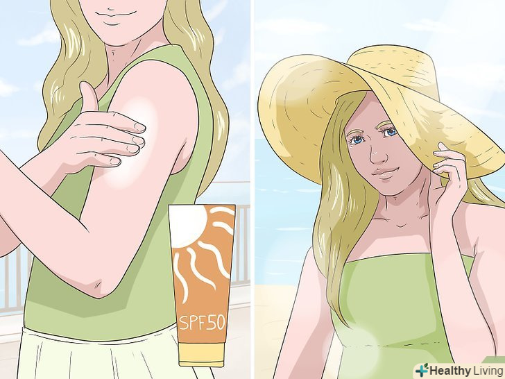 Дотримуйтесь заходів з профілактики онкологічних станів в майбутньому.щоб запобігти появі будь-яких форм раку шкіри, необхідно вжити деяких запобіжних заходів, які допоможуть захистити себе від таких проблем. Через те, що одним з ключових факторів виникнення раку шкіри є надмірне сонячне випромінювання, завжди слід користуватися сонцезахисними кремами (яких на сьогоднішній день величезний вибір). Вони повинні володіти захистом від УФ променів типу А і в (UVA і UVB), а також необхідно надягати захисний одяг, закриваючи найчутливіші ділянки тіла, коли ви виходите на вулицю. Такими чутливими до сонячного впливу ділянками тіла є шия і голова. Голову можна захистити, надівши легкий головний убір.- Існує міф, що людям з темною шкірою не потрібно користуватися сонцезахисним кремом — це помилка. Всім людям, незалежно від кольору шкіри, обов'язково рекомендується користуватися сонцезахисним кремом і носити захисний одяг.[14]