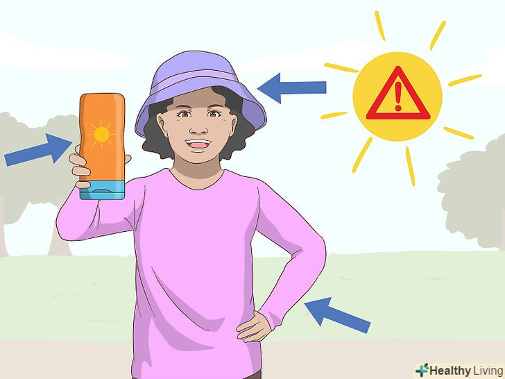 Уникайте інтенсивного сонячного світла.сонячні опіки призводять до стійкого пошкодження шкірних покривів. Діти, які в дитинстві хоча б раз отримували сонячний опік, схильні подвоєному ризику розвитку меланоми (одного з видів раку шкіри) в порівнянні з дітьми, які ніколи не обгорали на сонці.[7] вплив інтенсивного сонячного світла можна знизити, використовуючи одяг з довгим рукавом, штани, капелюх і сонцезахисні засоби. На порталі" здорова Росія " наведені спеціальні рекомендації щодо захисту від негативного впливу сонячного світла.[8]- Намагайтеся триматися в тіні і зведіть до мінімуму час, що проводиться на самому інтенсивному сонці (зазвичай в проміжку між 10:00 і 16:00).