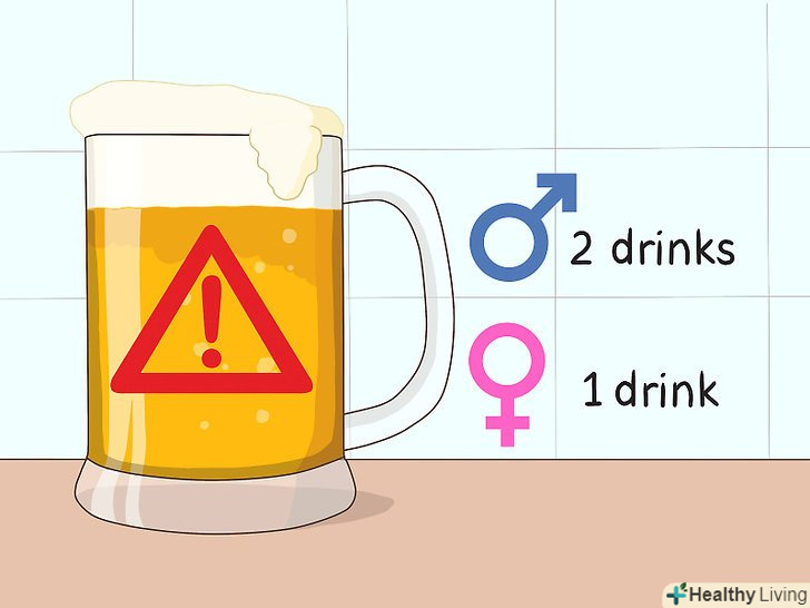 Вживайте алкоголь помірно. Алкоголь розщеплюється тілом до оцтового альдегіду, який є потенційним канцерогеном (речовиною, що викликає рак), здатним пошкодити ДНК.[9] Алкоголь у поєднанні з курінням створюють більш високий ризик розвитку раку, ніж обидва ці фактори окремо.[10] Американське товариство боротьби з раковими захворюваннями рекомендує чоловікам не вживати більше двох стандартних порцій алкогольних напоїв в день, а жінкам — більше однієї.[11]- Стандартною порцією вважається 0,35 л пива, 150 мл вина або 45 мл міцного алкоголю.