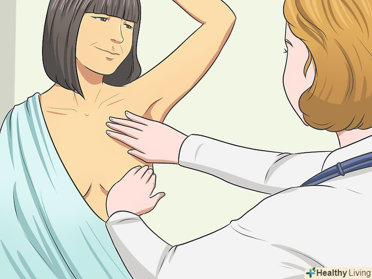Запишіться на обстеження в медичний центр або в поліклініку.на прийомі у гінеколога попросіть лікаря промацати ваші груди. Лікарів вчать цьому, тому гінеколог буде знати, на що слід звернути увагу. Не намагайтеся замінити цей огляд (нехай навіть він буде неприємним) на самообстеження.[20]- Спочатку лікар огляне груди візуально. Вас попросять підняти руки над головою, потім опустити вниз, щоб лікар міг оглянути розмір і форму. Потім піде фізичний огляд. Вас попросять лягти на кушетку, і лікар промацає всі груди, включаючи ділянки біля пахв і у грудної кістки. Огляд займе кілька хвилин.[21]
