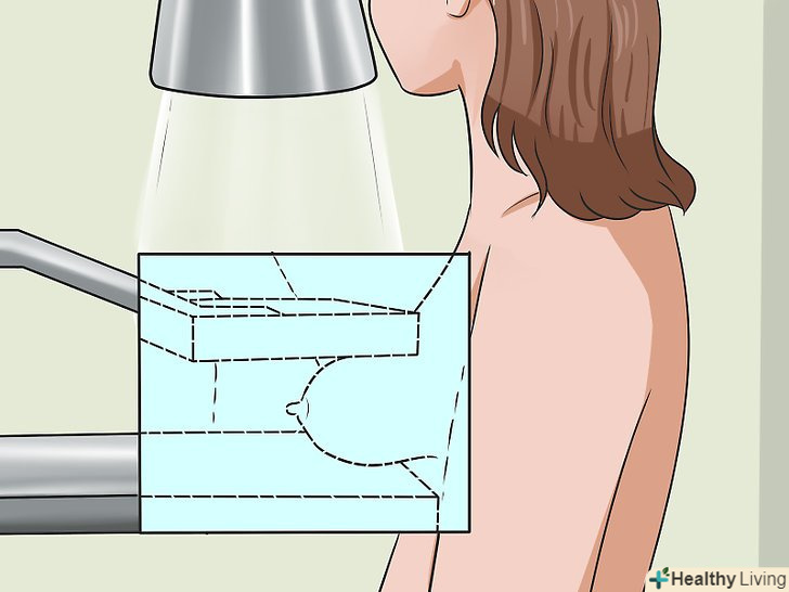 Пройдіть мамографію.мамографія-це спосіб обстеження тканин грудей за допомогою рентгенівського променя з невеликою дозою радіації. Це обстеження дозволяє виявити наявність пухлин до того, як їх можна буде намацати руками.[22] жінкам старше 40 років рекомендується проходити мамографію раз на рік або в два роки. Жінкам молодше 40, які потрапляють в групу ризику, слід порадитися з лікарем щодо частоти цієї процедури. Навіть якщо ви не входите в групу ризику, і у вас немає симптомів, вам слід робити маммограму раз на кілька років.[23][24]- При цьому обстеженні груди кладуть на платформу і стискають, а потім просвічують тканини рентгеном. Ви відчуєте тиск і, можливо, дискомфорт, але процедура швидко закінчиться. Мамографію роблять з обох сторін, щоб лікар міг порівняти зображення.