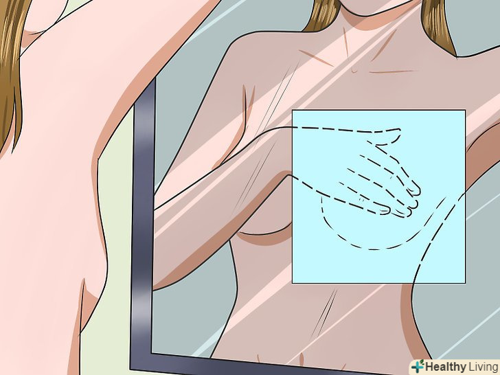 Огляньте груди візуально.це можна робити в будь-який момент, але краще займатися цим після закінчення менструації, коли груди перестане боліти і зменшиться в обсязі. Намагайтеся робити це щомісяця приблизно в один і той же час. Станьте або сядьте перед дзеркалом, знявши майку і бюстгальтер. Підніміть і опустіть руки. Зверніть увагу на зміни в розмірі, формі грудей, на хворобливість і будь-які утворення в тканинах, включаючи:[5]- Поглиблення і складки на шкірі (як кірка апельсина)