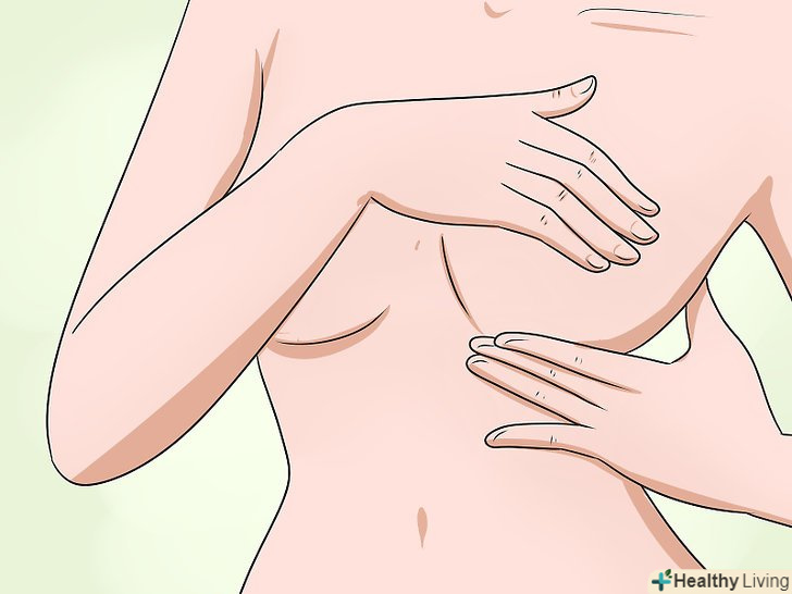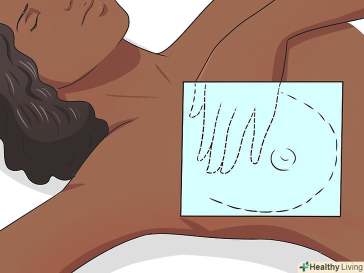 Обмацайте груди.якщо у вас менструація, найкраще робити це тоді, коли груди буде хворіти найменше, в ідеалі - через кілька днів після закінчення менструації.[6] можна обмацувати груди лежачи (в такому положенні тканина стає більш плоскою, і її простіше промацати) або стоячи в душі (вода і піна допоможуть пальцях ковзати по шкірі).[7] промацувати груди слід так:- Ляжте на спину і покладіть праву руку під голову. Першими трьома пальцями лівої руки промацайте тканину грудей справа. Торкайтеся всіма подушечками пальців, а не тільки кінчиками.[8]