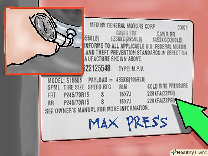 - Зверніться до керівництва по експлуатації від заводу-виробника, або подивіться на внутрішню сторону дверей водія, щоб дізнатися стандартні значення тиску холодної шини.це значення є найменшим PSI, рекомендованим виробником, до якого можна надувати шини. Читайте далі, щоб дізнатися, чому тиск може бути вище.