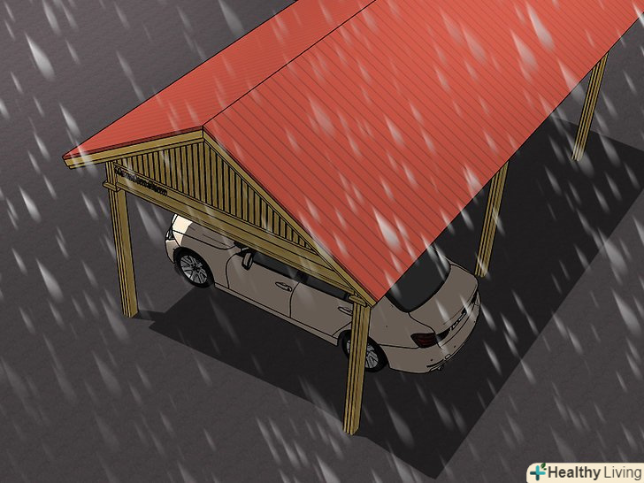 Якщо у вас немає навісу для автомобіля, побудуйте його.у дворах деяких будинків такі навіси передбачають при забудові. Якщо у вас Він є, припаркуйте під ним свою машину до початку грози. В іншому випадку купите недорогий навіс на сайті господарського магазину і самі його встановіть.[9]- Недорогі навіси зазвичай коштують в межах 10 000-15 000 рублів. Для його установки вам буде потрібно приблизно дві години.